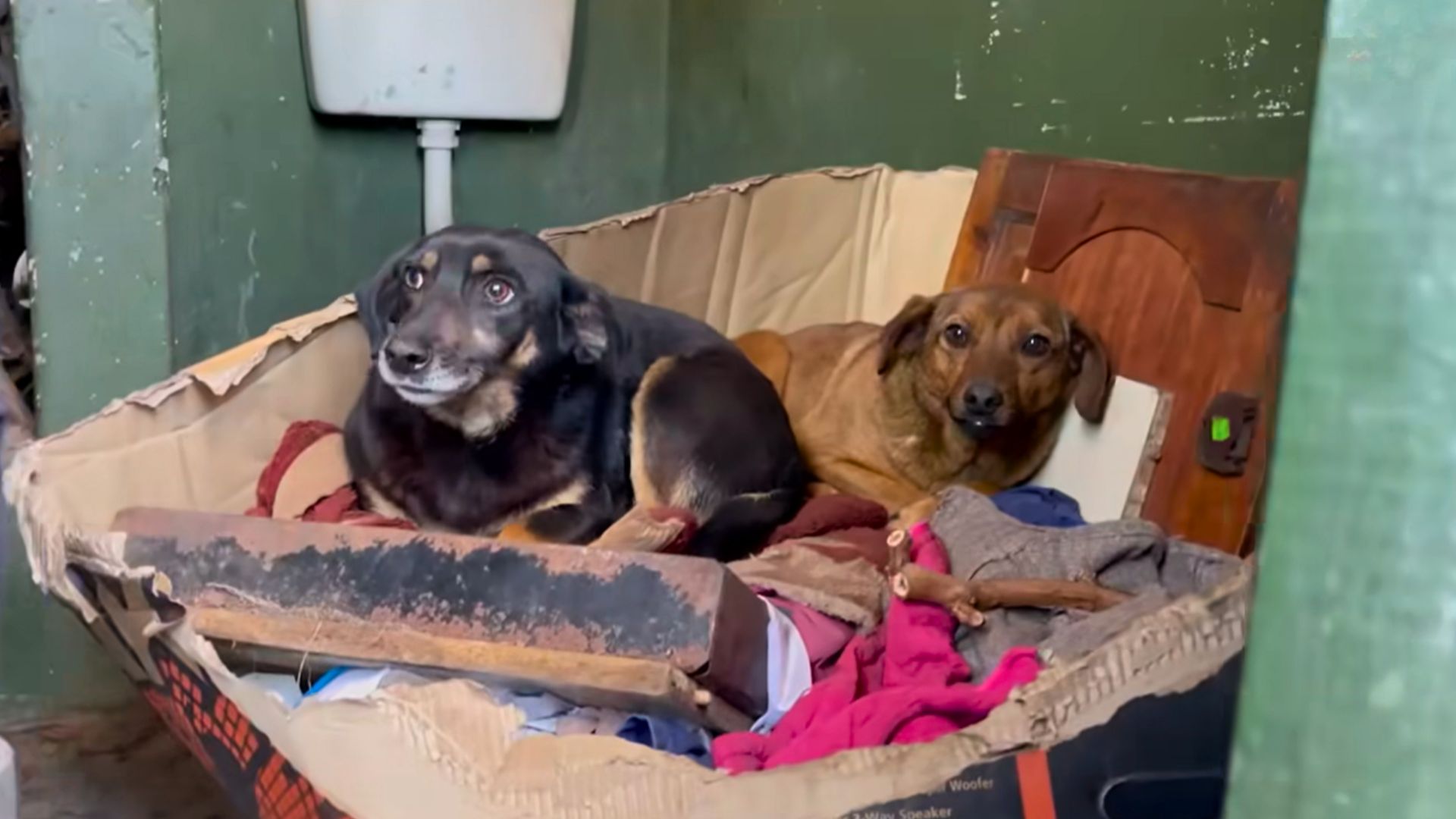 When two doggo siblings got dumped by their previous owners, they decided to hide in a box in an outdoor bathroom and not trust humans ever again.